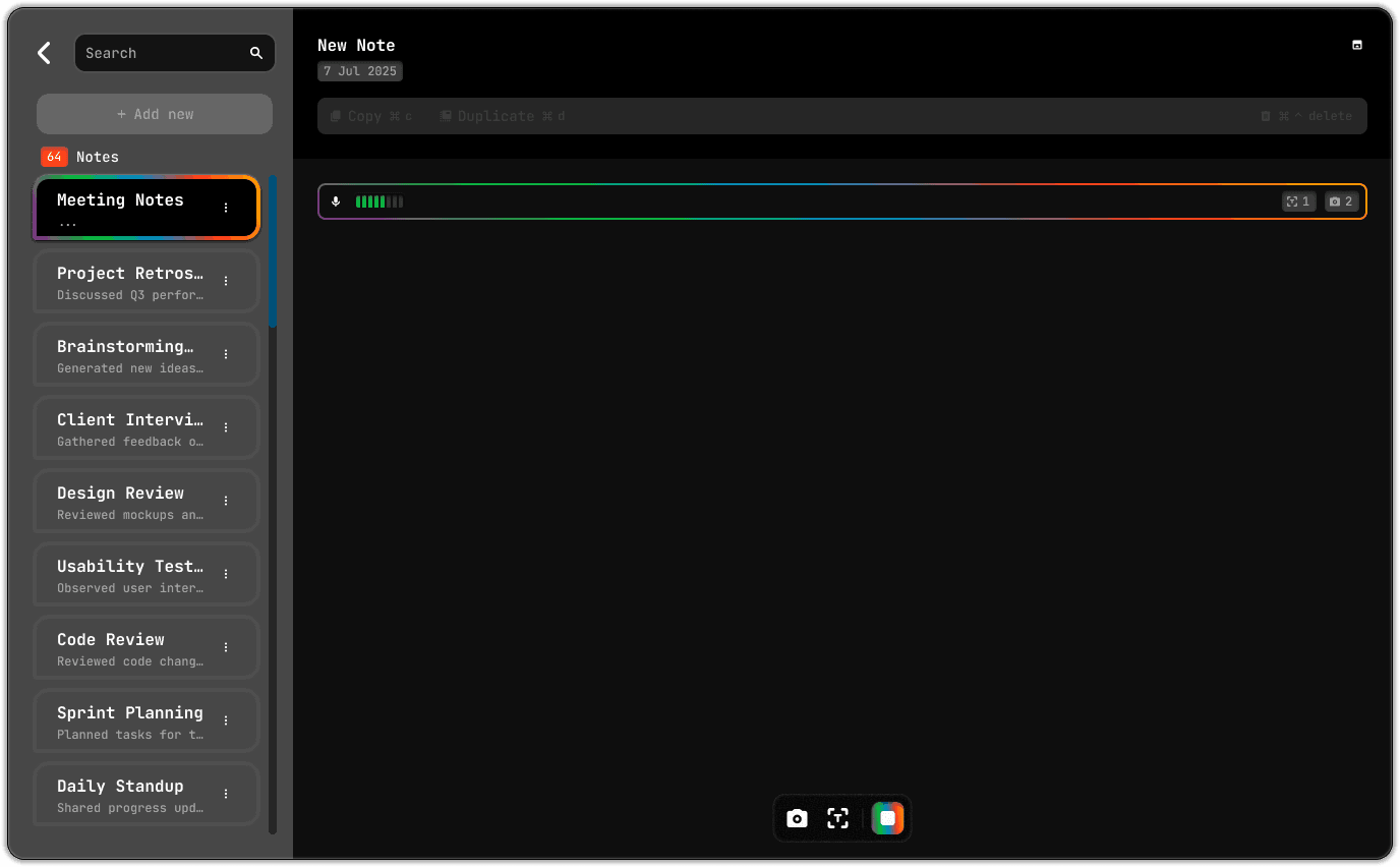 Start a recording from anywhere with a custom keyboard shortcut. June opens instantly, captures your voice or screen, and stores the moment before it slips away.